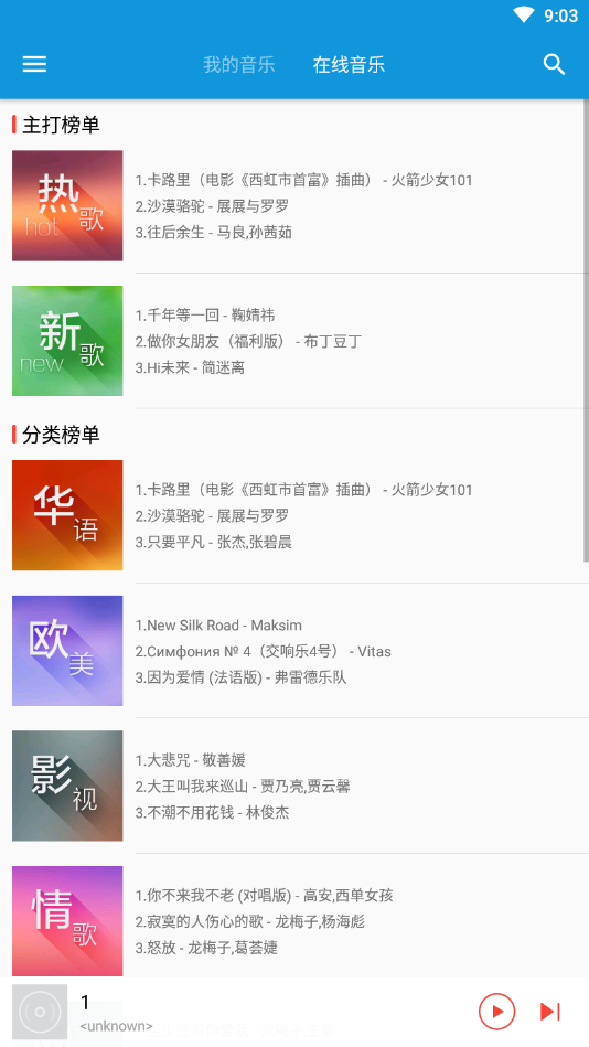 华语榜单:精选当下最受欢迎的华语金曲,涵盖流行、摇滚、民谣等多种音乐风格。