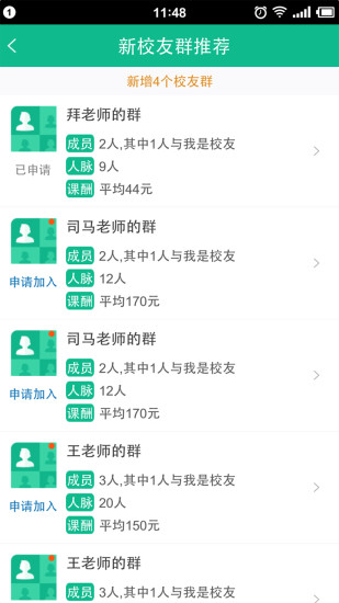 财务管理系统迎来重大升级,新增"收学费"、"我的订单"、"课时确认"、"账户预存查询及提现"等功能入口,实现教学财务的闭环管理。智能匹配系统现在可以自动搜索用户好友所在群组,在获得管理员授权后向用户推荐优质群资源,并直观展示群成员规模、好友关系网络以及群内平均课酬水平。