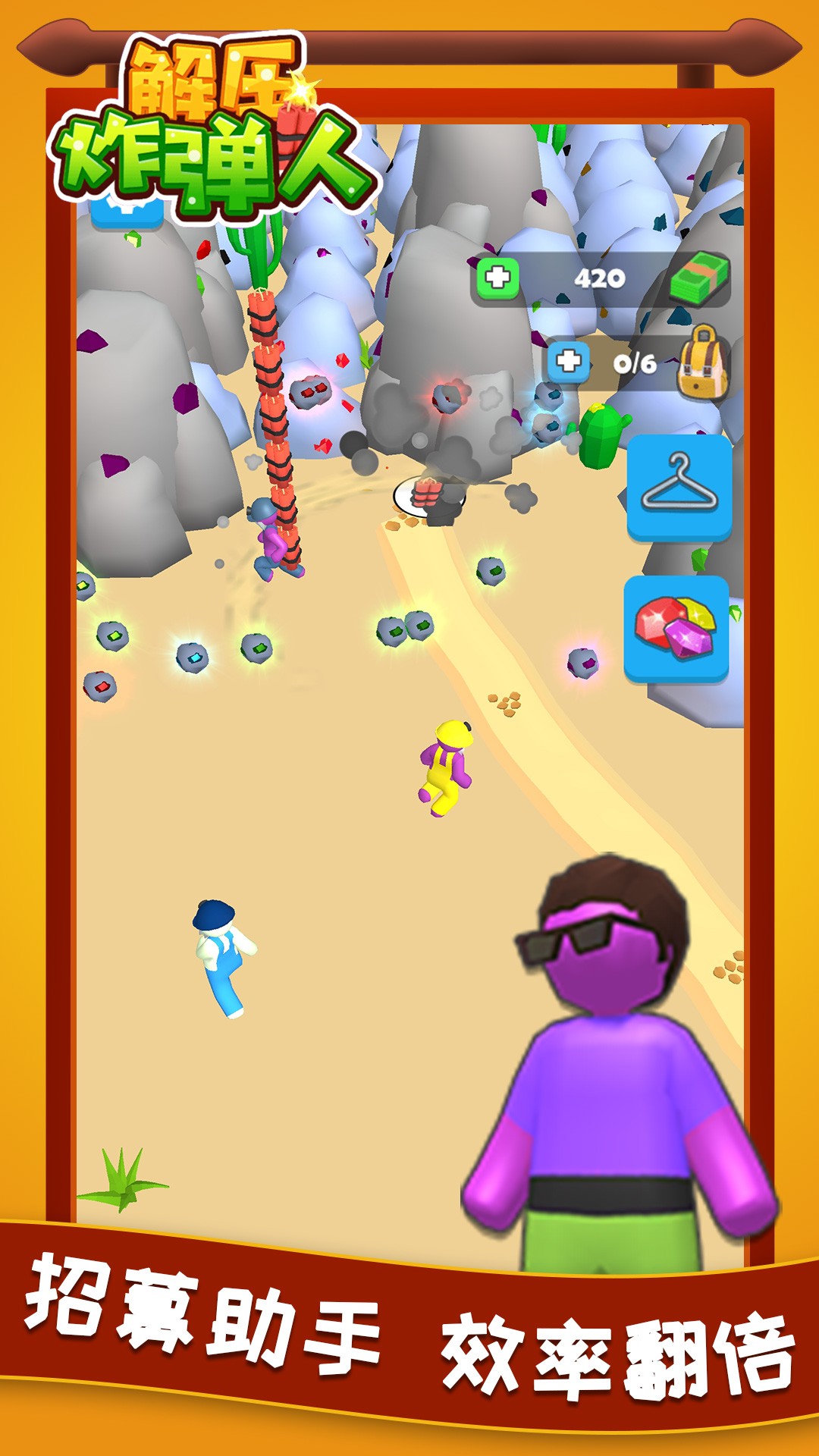 《解压炸弹人》是一款充满趣味性的经营采矿类游戏,玩家需要通过策略性地放置炸弹来开采矿山中的珍贵矿源。游戏的核心玩法在于如何用最少的炸弹获取最大的收益,随着矿场规模的扩大,玩家可以解锁更多高级炸弹和采矿设备。独特的爆炸特效和轻松的操作方式让游戏过程充满解压快感,同时丰富的经营元素也让玩家能够体验到从小矿工到矿业大亨的成长乐趣。无论是单人挑战还是与朋友合作,都能在这款游戏中找到属于自己的快乐。
