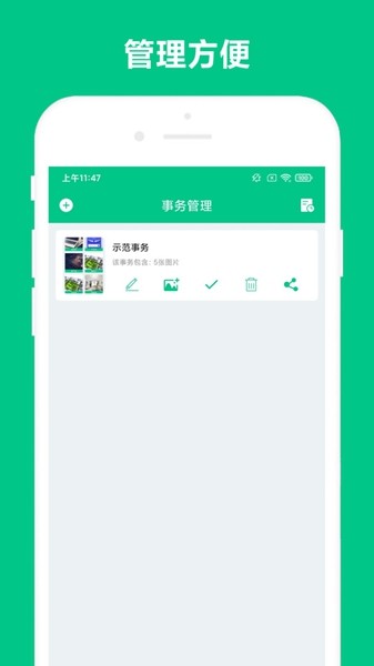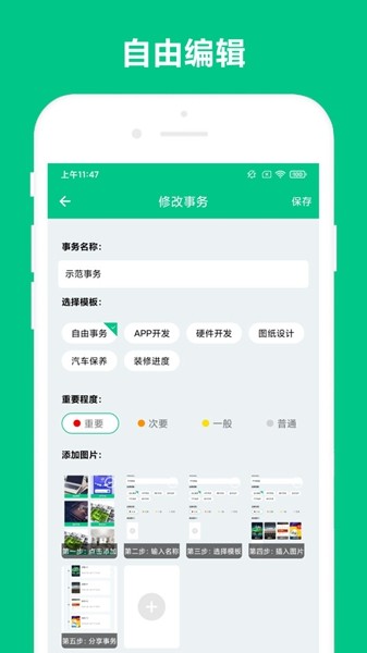 照片记录功能是该应用的另一大亮点,拍摄的照片不仅会记录时间和地点信息,还能智能归类到对应的事务节点中。用户可以为每张照片添加详细说明,系统会自动将这些信息同步到云端,确保数据安全不丢失。