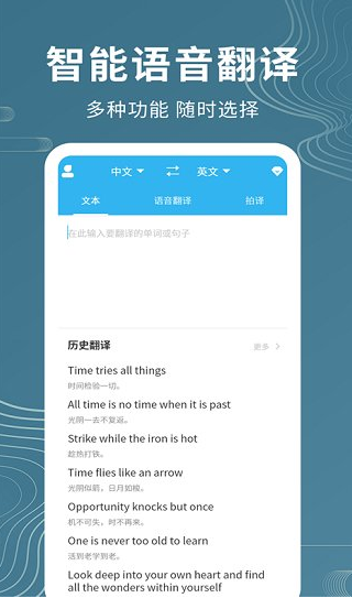 文本翻译:用户可以直接输入或粘贴需要翻译的文字内容,支持批量处理和长文本翻译。应用提供多种译文风格选择,包括正式、口语化、简洁等模式,满足不同场合的翻译需求。历史记录功能还能保存过往翻译内容,方便随时查阅。
