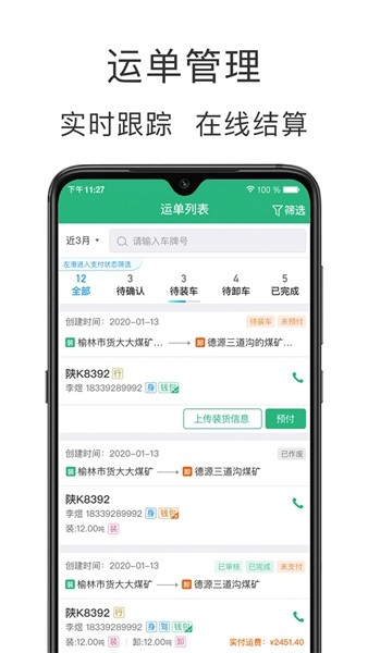 承运订单跟踪:实时更新运输中或已完成的订单状态,用户可以随时点击查看详情,掌握每一笔订单的完整信息。