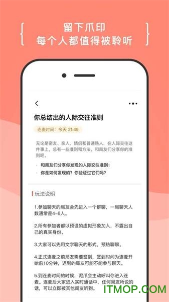 递爪是一款专为年轻人打造的创新型社交平台,它巧妙地将"蒙面舞会"的概念融入线上社交场景。在这里,每位用户都以独特的代号身份参与互动,这种设计既保护隐私又增添了神秘趣味。平台每天更新数十个热门话题房间,从"二次元同好会"到"旅行达人分享",覆盖了年轻人最关注的兴趣领域。特别值得一提的是,递爪首创的"主题派对"模式,让用户可以根据当下心情选择不同主题的聊天室,确保每次交流都能碰撞出精彩火花。