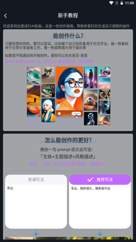 开始创作:进入主界面后,您可以选择"文字生成"或"图片转换"两种创作模式。输入详细的描述文字或上传参考图片,AI将根据您提供的信息进行创作。