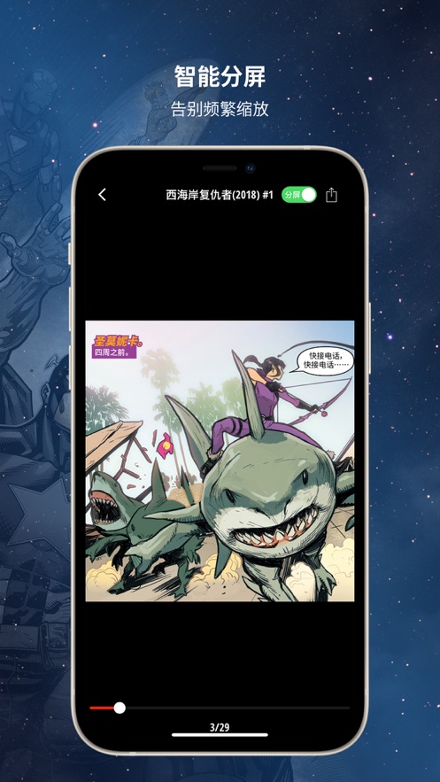 漫威无限是漫威漫画官方推出的中文正版阅读平台,为全球漫威粉丝打造了一个沉浸式的漫画宇宙。作为漫威官方独家授权的订阅平台,这里汇聚了漫威80余年来的经典作品与最新连载,从复仇者联盟、X战警到银河护卫队,所有你喜爱的超级英雄故事都能在这里找到。平台不仅提供海量正版漫画资源,还拥有独特的智能分屏阅读模式,让你可以清晰欣赏漫威编辑精心设计的每一格分镜,体验前所未有的阅读乐趣。