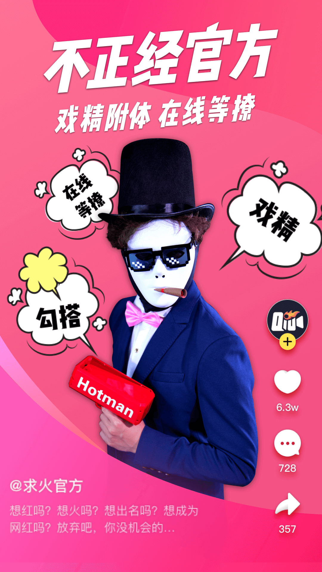 谁说官方账号就一定要一本正经?求火app的官方运营团队个个都是戏精本精,随时准备与你互动。真人在线,不仅随时可以撩,还会不定期带来各种彩蛋和惊喜活动。在这里,官方与用户的距离从未如此之近,快来和我们一起玩转创意吧!