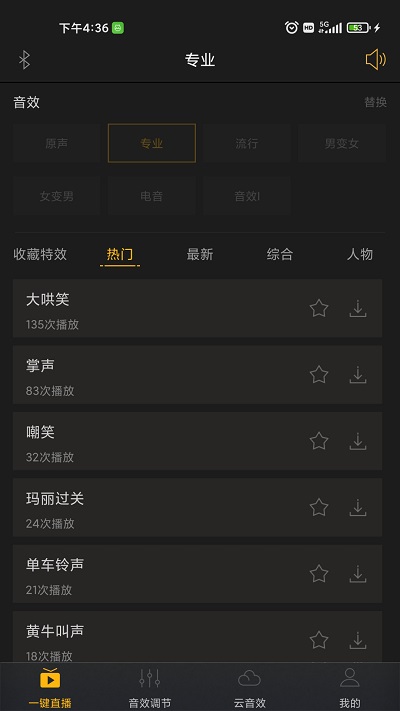 【一键直播】内置海量专业直播音效库,包括掌声、笑声、背景音乐等,一键即可调用,让直播更加生动有趣。