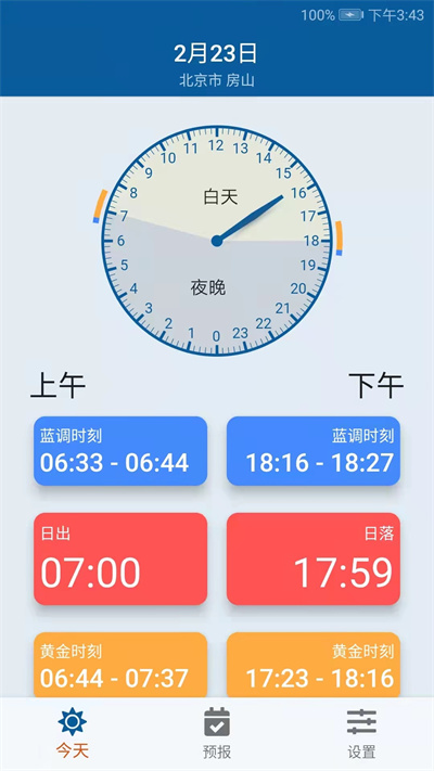 ·提供精准的日出日落信息,蓝调时刻黄金时刻都有展示,数据精确到分钟级别
