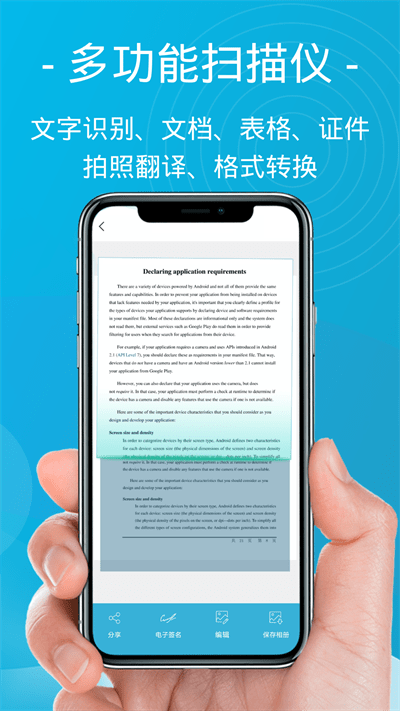 可以快速的保存不同的文件格式到你的手机中,而且还可以及时的了在线处理不同的文件。支持云端同步功能,让您随时随地访问和管理扫描文件。