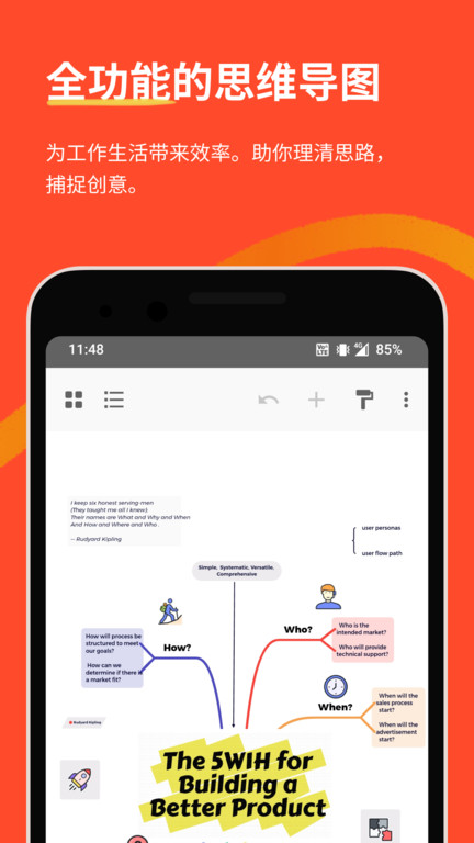 这款专业版思维导图软件将艺术性与实用性完美结合,让你的思维过程既清晰又美观。你可以创建个性化的工作流程,专注于每个想法的延伸和梳理;在无限延伸的脑图幕布上自由发挥创意;还能轻松记录日常生活中的各种灵感、会议要点或项目规划,享受逻辑思维带来的乐趣。