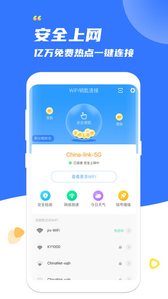 万能WiFi破解密码是一款功能强大的WiFi连接管理工具,能够帮助用户轻松连接周围的免费WiFi热点,解决流量不足的烦恼。无论是日常上网、追剧、游戏还是社交聊天,它都能为你提供稳定快速的网络连接。此外,用户每天签到还能获得积分,兑换手机流量,让你的上网体验更加无忧。该应用不仅能智能优化上网速度,还能实时检测网络安全,全方位保障你的上网环境安全可靠。