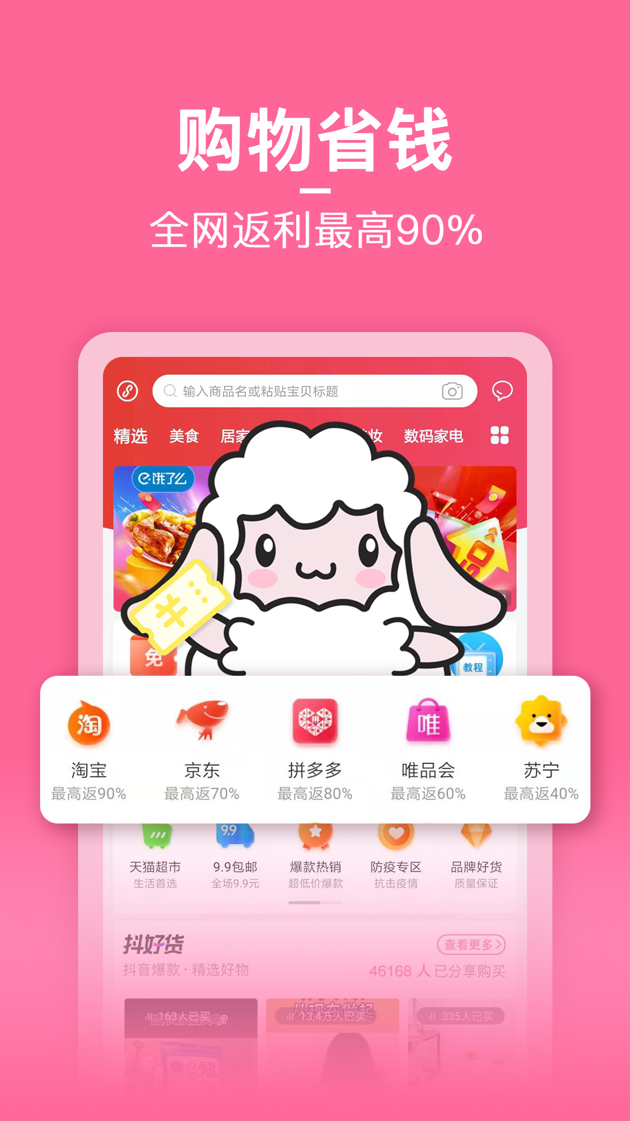 整合京东、唯品会、拼多多、苏宁、美团和饿了么等主流购物平台。更多的折扣等着你去发现,一站式比价更省心。平台间优惠可叠加使用。