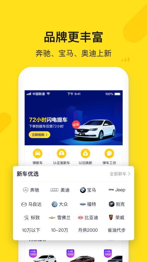 弹个车app是一款专注于为用户提供便捷线上购车服务的移动应用平台,汇聚了海量优质车辆资源,让您足不出户即可轻松完成选车、购车全流程。平台严格筛选合作厂商,所有上架车辆均通过权威认证,确保车源品质可靠,让您买得放心、用得安心。无论您是追求经济实用的家用轿车,还是青睐豪华高端的品牌车型,弹个车app丰富的车型库都能满足不同用户的购车需求,真正实现一站式购车体验。