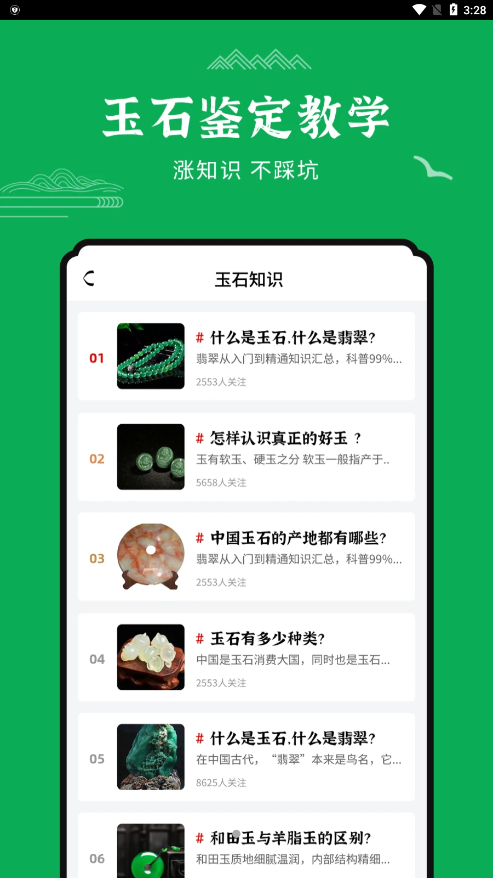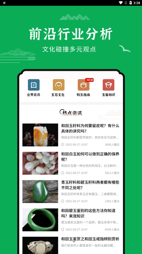 资讯:为玉友们提供专业的玉石、翡翠、玉器等知识讲解,让玉友们快速入门玉石,便于理解玉石文化,同时能够及时掌握业界资讯,避难踩坑。平台每日更新行业动态、市场行情和收藏指南,帮助用户把握投资收藏的最佳时机,避免购买到假冒伪劣产品。