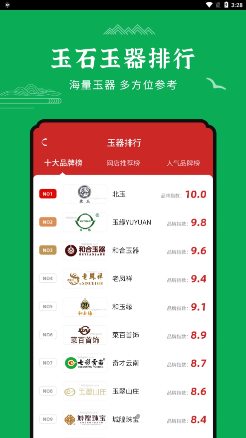 玉石排行:实时统计行业玉器排行情况:玉石品牌、店铺、人气榜单,为玉友提供前沿的行业分析和可靠参考。榜单数据来源于专业机构调研和市场交易数据,涵盖各类玉石品种的市场表现,帮助用户了解收藏价值和投资潜力。
