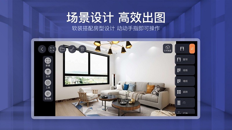 场景设计,高效出图:创新的智能布局系统可快速生成多种设计方案,支持一键切换不同软装搭配,让设计创意即刻呈现。