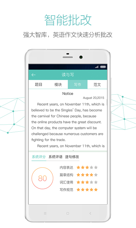 智能词汇学习功能通过算法分析用户的词汇掌握情况,只推送需要记忆的单词,大幅提升背词效率。阅读与完型训练采用真题与模拟题交替呈现的方式,每完成一个学习单元都会立即获得详细反馈和名师解析。长难句与翻译模块由专业教师指导用户分析句子结构,标注核心词汇,深入理解句子含义,为阅读、翻译和写作打下坚实基础。智能写作批改系统如同私人教师,可随时提供作文修改建议,还有大量优质模板可供参考,让写作练习事半功倍。