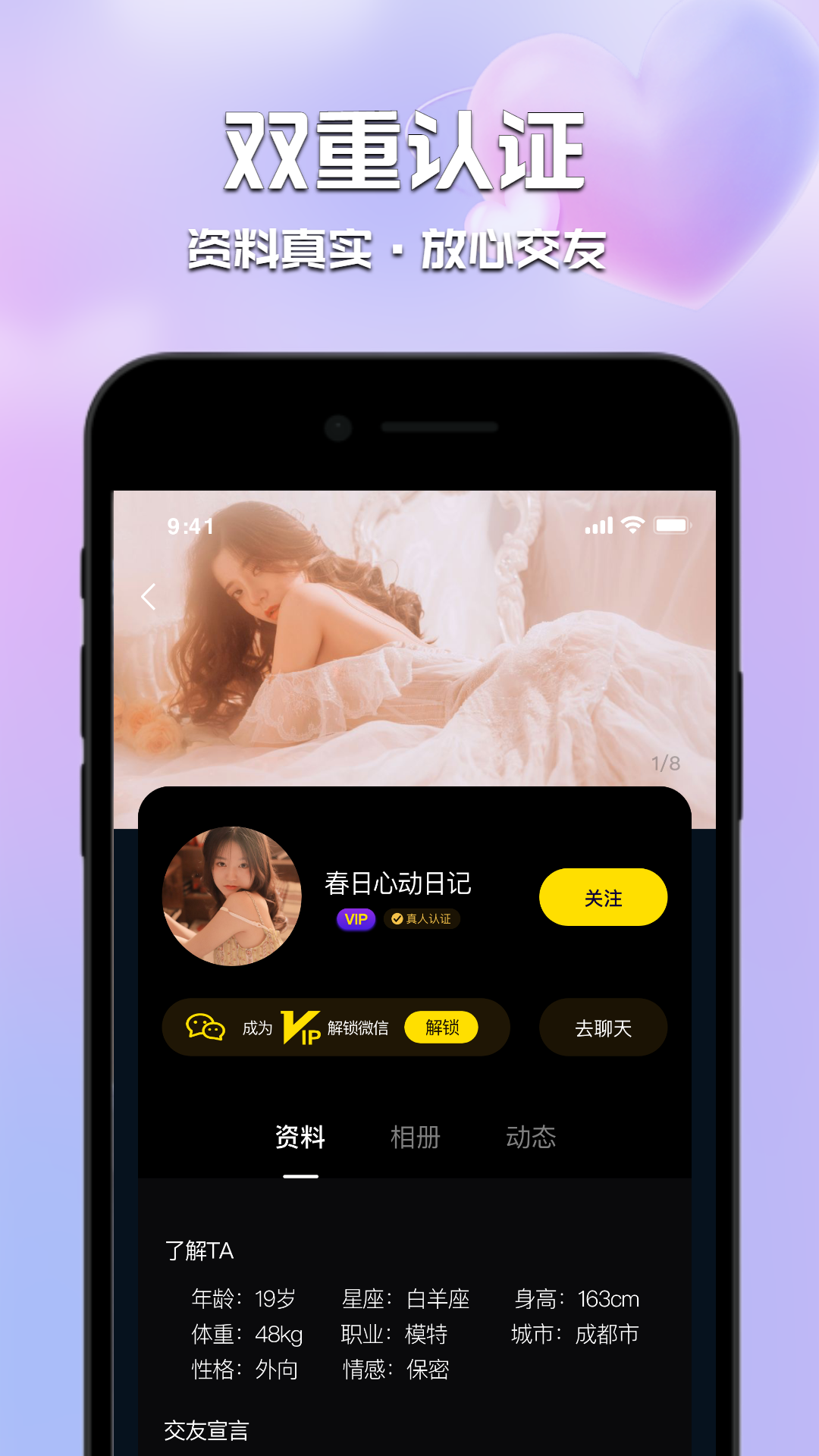 高清视频通话功能让你更真实地感受对方的魅力;严格的实名认证体系确保交友环境的安全可靠;创新的约会记录功能,通过精美视频剪辑保存美好瞬间,让每一段回忆都值得珍藏。
