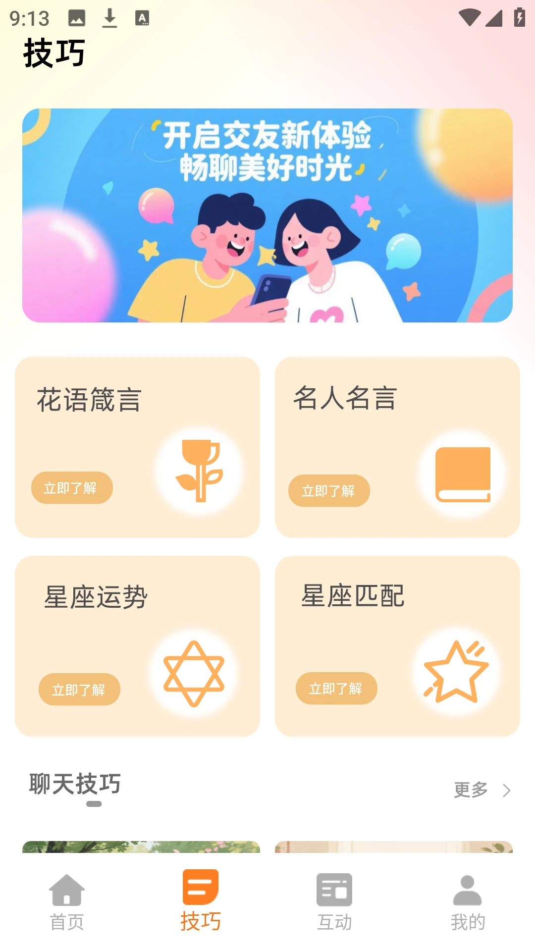 秘语空间box是一款个性化的交友应用,其包含了国际跳棋、你比我猜、大话骰子等交友互动功能,也有土味情话、文化谚语、名人名言、早安心语以及晚安心语等经典语录,同时还有心理学知识以及聊天技巧等相关视频,让你的交友体验更加丰富多彩。