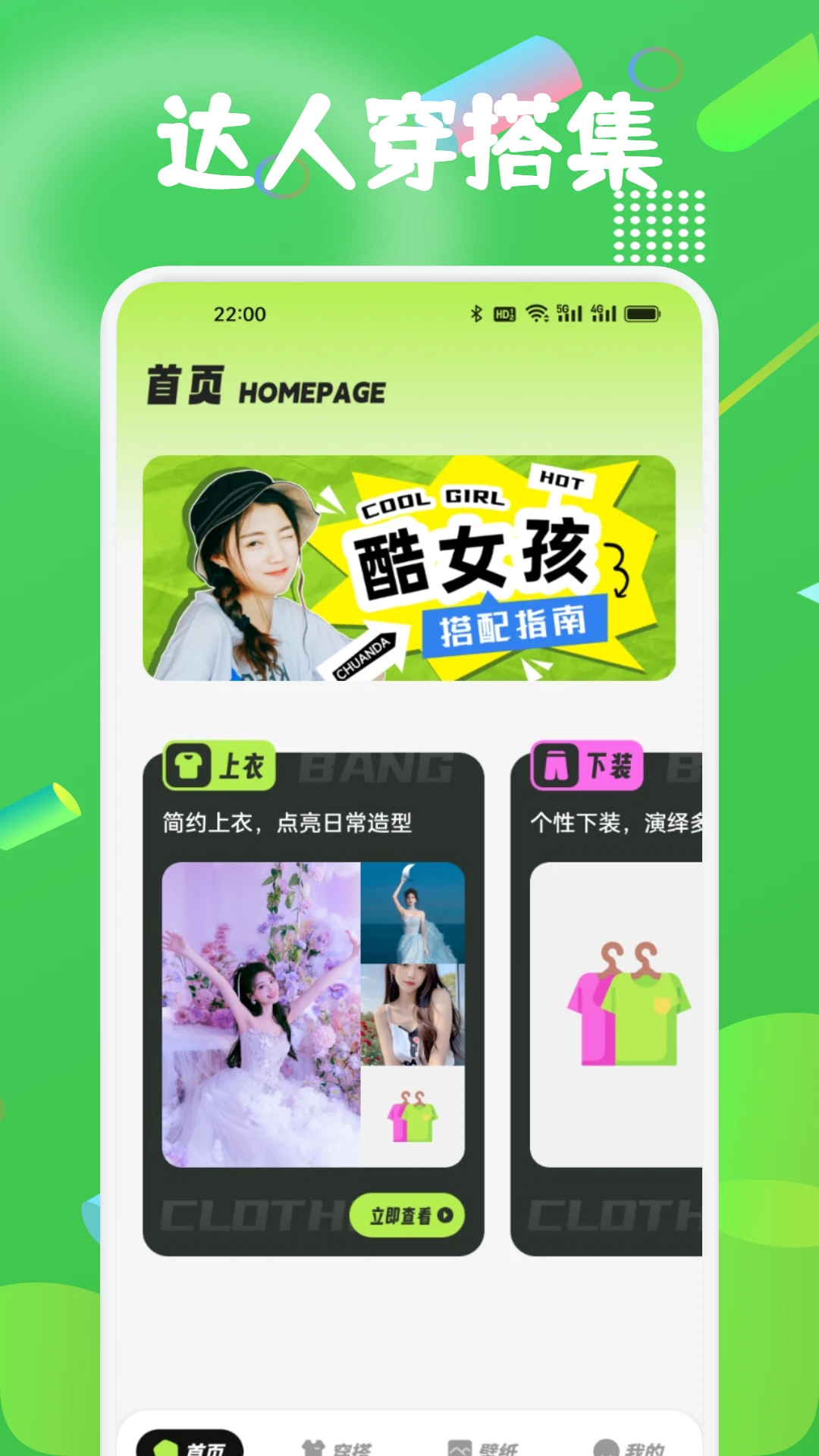 这款穿搭应用涵盖多类功能:首页提供酷女孩搭配指南,可查看上衣、下装等单品;穿搭页有女生叠穿攻略,含购衣计划、时尚搭配内容;壁纸页可获取穿搭、衣橱类壁纸;我的衣橱页能分类管理衣物信息,轻松搞定穿搭与衣橱整理。