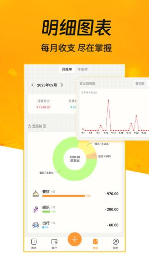 --账单明了:软件提供周统计、月统计和年统计功能,通过直观的图表展示消费趋势。用户还可以一键导出账单,方便与家人或朋友分享,共同制定理财计划。