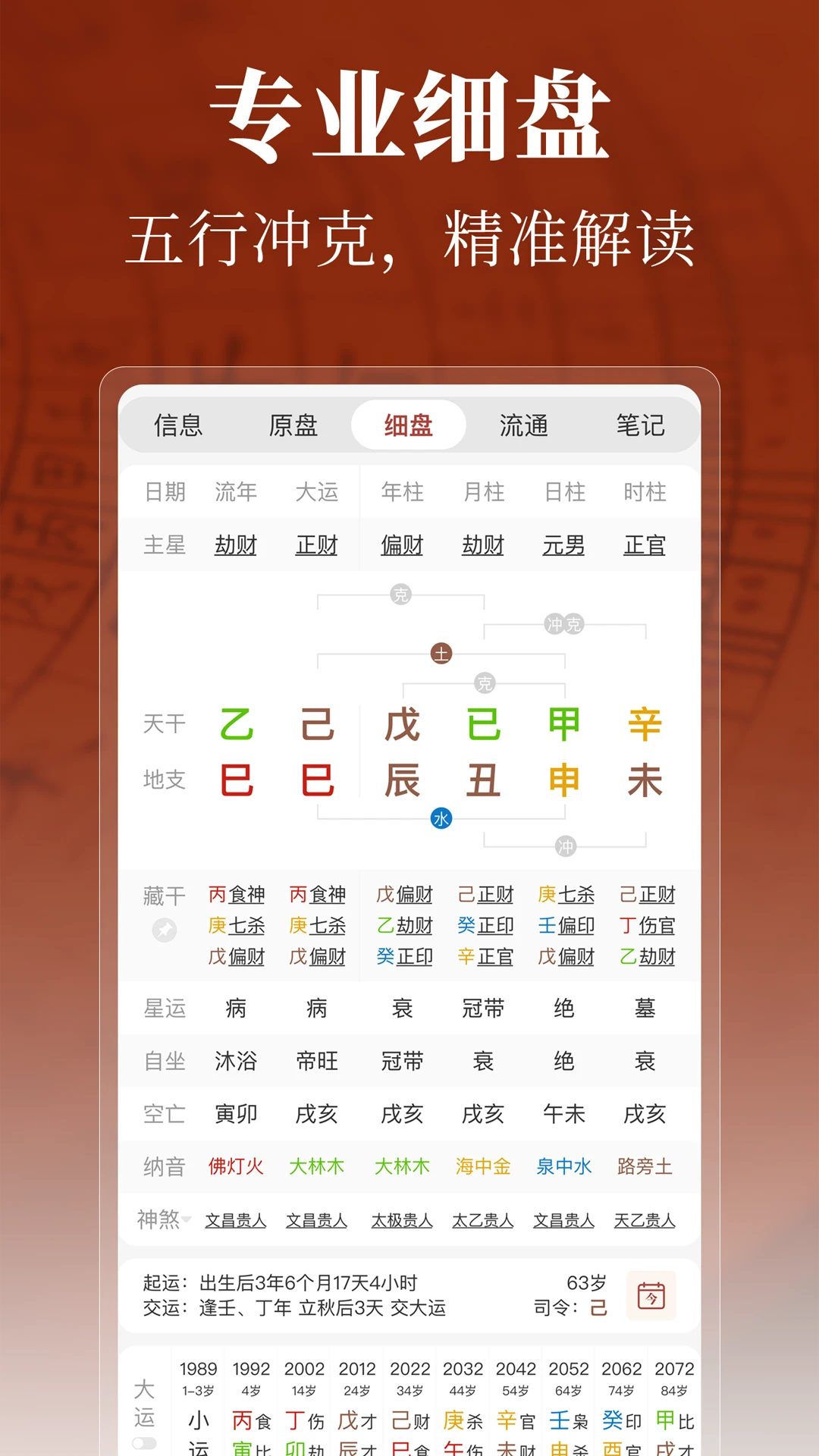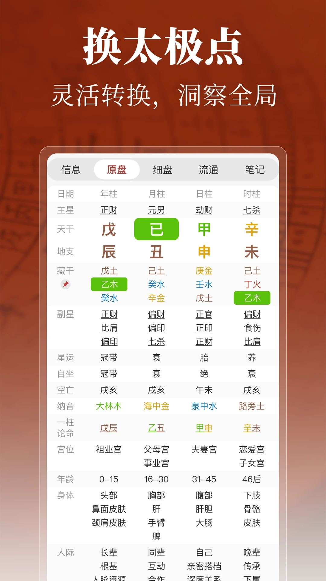 智能排盘系统:支持一键生成四柱八字、十神关系、大运流年等完整命盘,无需复杂操作