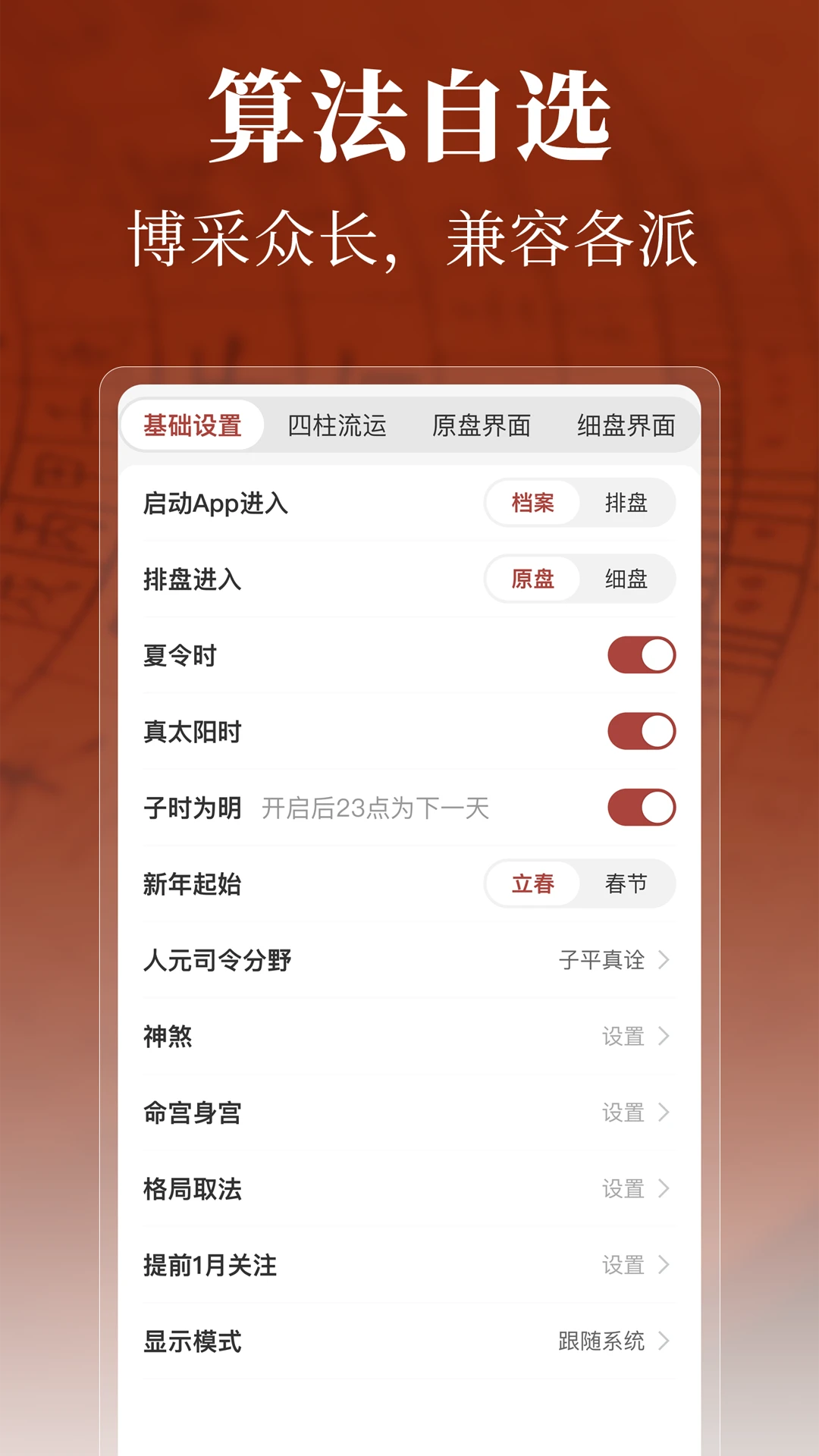 流派自定义设置:自由切换子平、紫微等不同学派排盘规则,适配专业研究需求