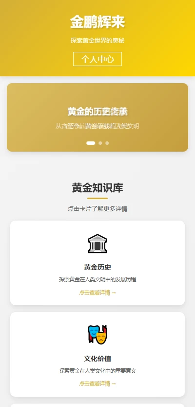 金鹏辉来是一款探索黄金世界奥秘的科普应用。从承载五千年人类文明的历史传承,到作为现代投资理财工具的特点,系统介绍黄金的知识。通过详实的数据展示其纯度、密度、熔点等物理特性,结合知识库与趣味挑战,让你深入了解黄金的方方面面。