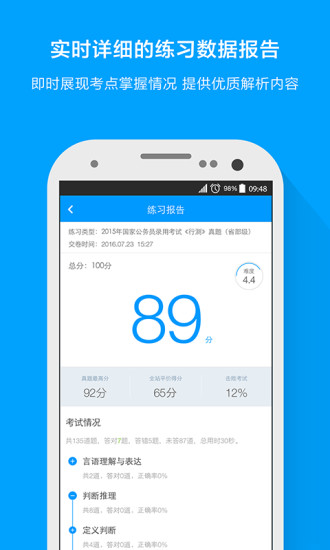 十年真题,五大专项:软件收录了十余年国考和省考的完整真题库,每道题目的答案解析都经过两位授权名师的双重审核,确保准确性和权威性。题库内容覆盖言语理解、数量关系、判断推理、资料分析和常识判断五大专项,细分160个核心考点,用户可以针对薄弱环节进行专项训练,实现各个击破的备考效果。