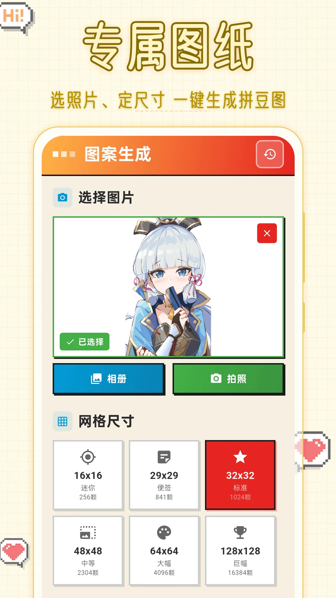 一键将照片转化为拼豆图纸,支持尺寸与配色自由调整,让创作触手可及;