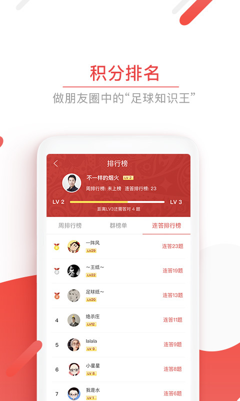 追球英雄不仅是一款简单的问答游戏,更是一个充满挑战的足球知识竞技场。在游戏中,你可以通过回答各种难度的问题来赚取追球币,这些追球币不仅可以用来提升你的等级积分,还能让你在排行榜上占据更有利的位置。随着你积累的积分越来越多,你将有机会在榜单中傲视群雄,成为真正的足球知识达人。