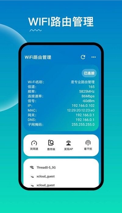 实时查看同网络连接终端,掌握设备接入情况;扫描附近AP热点,了解周边网络环境;分析信道干扰情况,优化wifi信号质量;支持周边wifi快速切换;提供专业的网速测试功能,让您随时掌握网络性能。