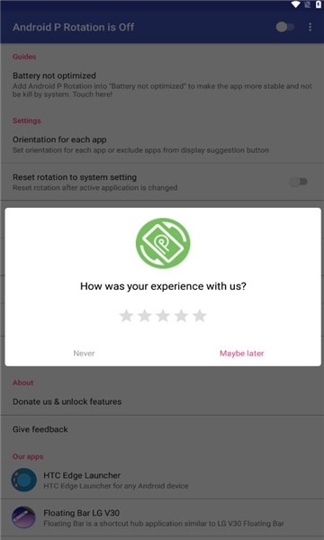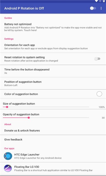 这款应用提供了丰富的个性化设置选项,让你可以完全掌控屏幕旋转的每个细节。你可以为每个应用程序单独设置屏幕方向,或者从旋转建议列表中排除特定应用。当关闭自动旋转功能时,系统会默认锁定为纵向模式,但你可以随时通过右下角的旋转建议按钮快速调整方向。此外,应用还支持按钮位置和颜色的自定义设置,让你可以根据个人喜好打造专属的操作界面。整个应用体积小巧,操作简单直观,却能带来强大的功能体验。