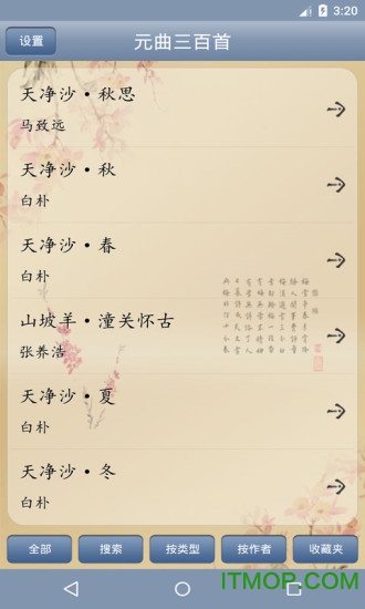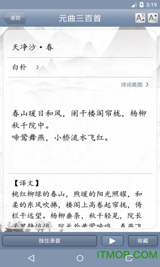 元曲三百首是一款专注于元曲赏析与学习的专业软件,为用户提供全面便捷的古典文学体验。通过这款应用,您可以随时随地畅游元曲的艺术殿堂,享受智能搜索、语音朗诵、免费阅读等丰富功能。软件不仅收录了完整的元曲作品,更配有精准的注释和赏析,让晦涩难懂的古典文学变得通俗易懂。无论是文学爱好者还是专业研究者,都能在这里找到适合自己的学习方式,感受元曲独特的语言魅力和深厚的文化底蕴。