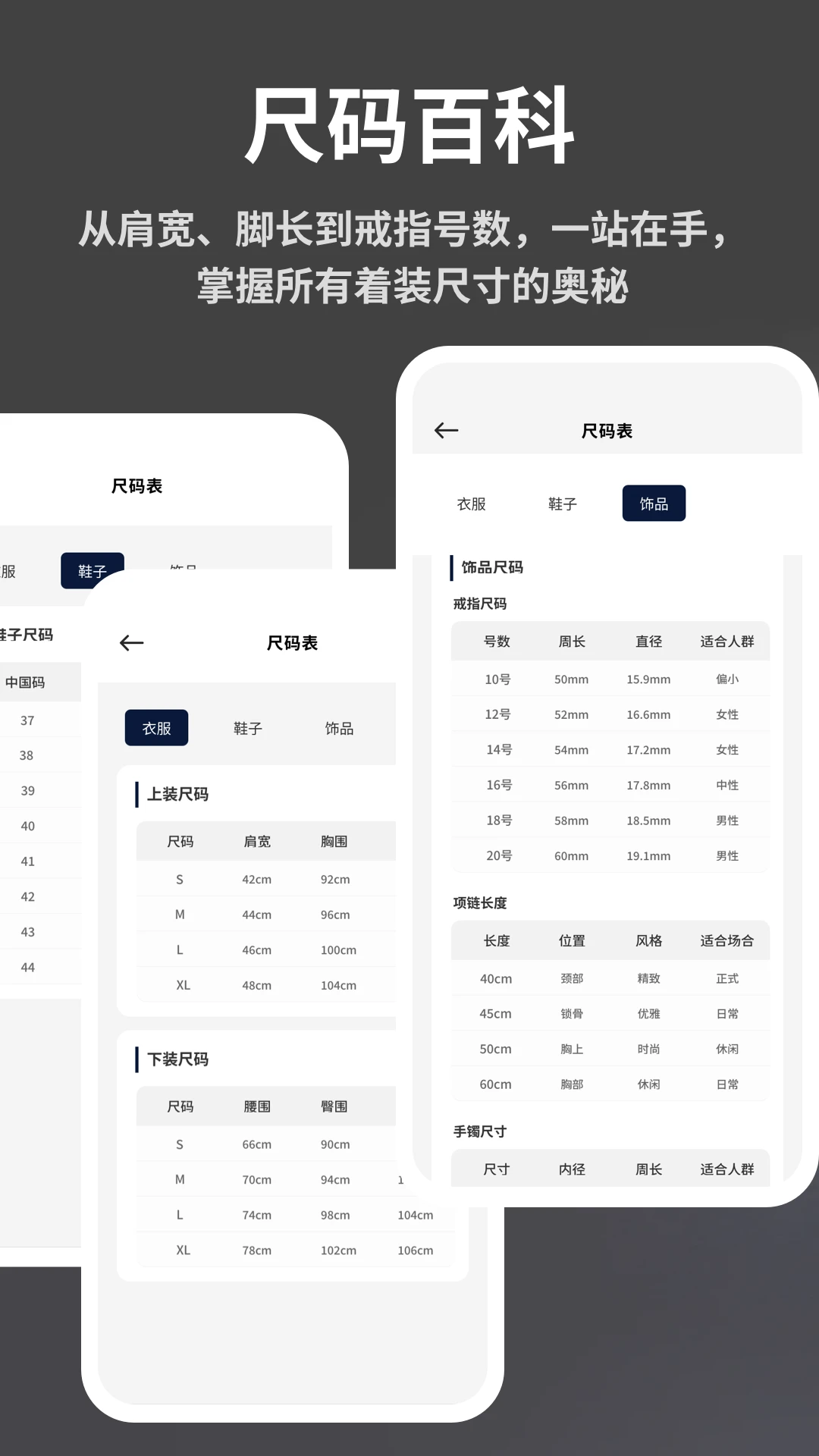 标准尺码对照:提供全球主流品牌的尺码对照表,购物时一键查询,避免选码错误。