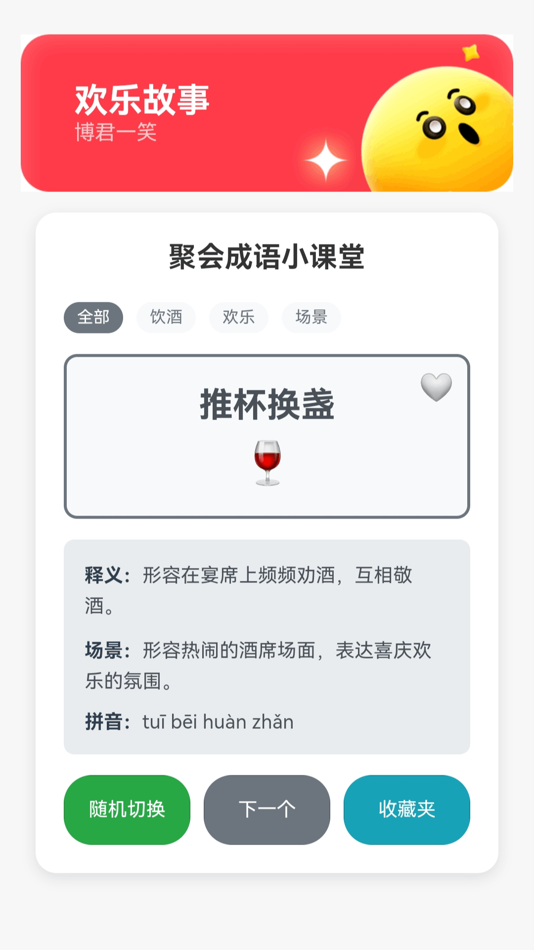 欢乐故事板块为用户提供了丰富多彩的成语故事内容。这些故事经过精心编排,既有历史典故的严谨性,又融入了现代幽默元素,让学习过程充满乐趣。每个故事都配有精美的插画和生动的配音,用户可以选择不同的阅读模式,包括自主阅读、听书模式等。此外,欢乐故事还特别设计了互动环节,用户可以在阅读过程中参与答题、解谜等小游戏,进一步加深对成语的理解和记忆。