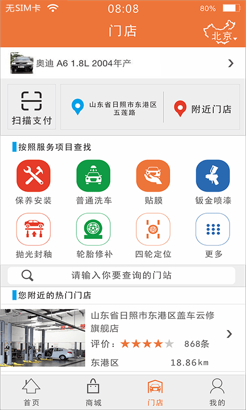 门店:附近热门门店,手机随时随地智能推荐,基于LBS定位自动排序,显示用户评价和距离信息。