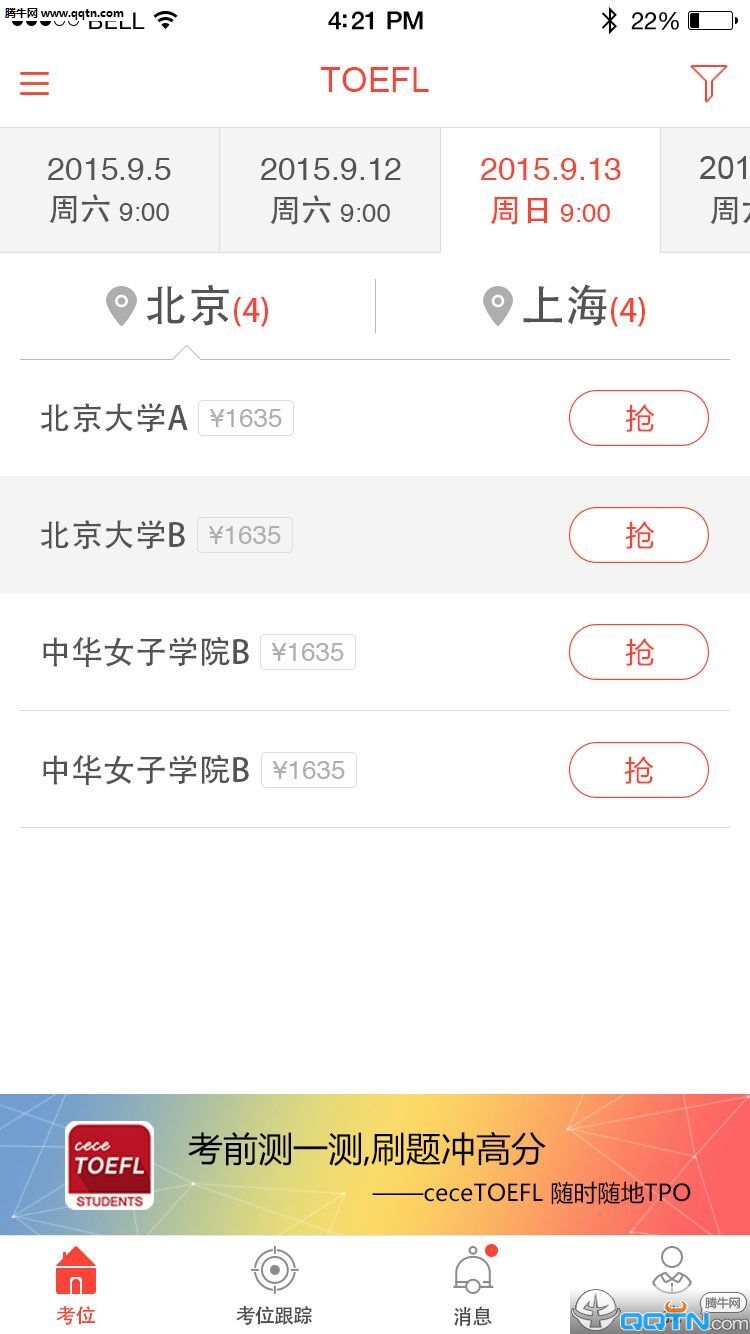作为一款专业的考试报名辅助工具,cece抢考位深度聚焦中国大陆考生在报名SAT、TOEFL(托福)和IELTS(雅思)考试时遇到的各类难题。通过智能化的系统设计,它能帮助考生快速锁定心仪的考位,彻底告别传统报名方式中繁琐的英文页面操作和漫长的等待时间。同时,应用还提供考试成绩实时推送服务,用户只需一键绑定考试账号,即可第一时间获取考试成绩,真正做到考位考分一手掌握。