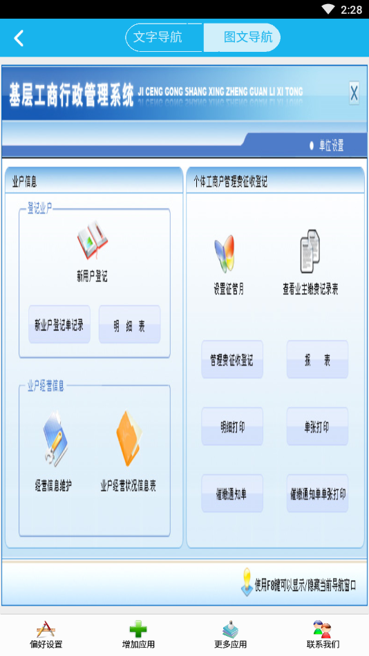本应用提供手机运行版本,同时我们还支持电脑单机版和网络版服务。网络版特别实现了手机端与电脑端的数据实时同步和共享功能,让工商管理人员可以随时随地开展工作。《基层工商行政管理系统》全面覆盖了各级工商管理部门的核心业务需求,包括业户登记、工商管理费用征收等重要工作内容。