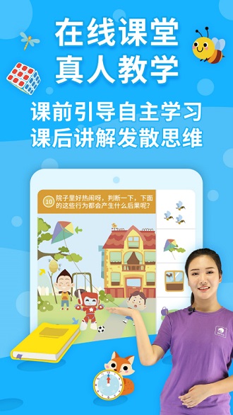 真人教学,全程伴学——专业教师团队课前知识点梳理,引导儿童自主探究;课后结合具体知识点详尽解析,使儿童思维能力得到全面提升。