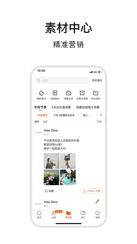 【素材馆】精选素材品质种草快速转化,每周更新热门营销素材,支持一键转发到社交平台。