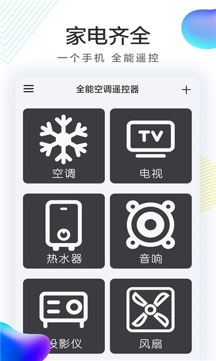 【家电齐全】:本款APP对应六大家电,包括:空调、电视、热水器、音响、投影仪、风扇。几乎涵盖了家庭常用家电设备哦!同时支持智能家居设备的接入,让您的智能生活更加完整。无论是客厅娱乐系统还是卧室舒适设备,都能轻松掌控。
