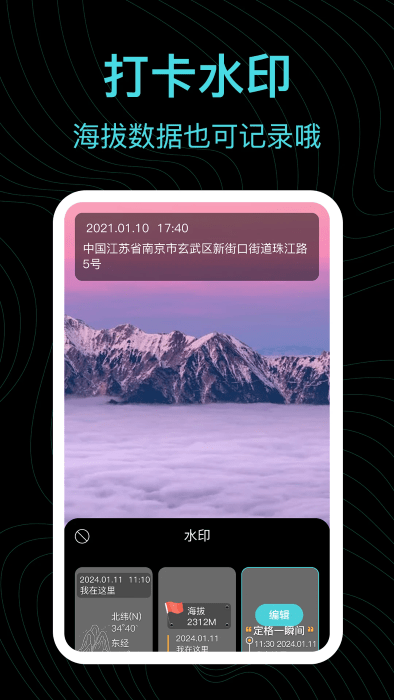 这是一项极具特色的功能,让您拍摄的照片自动记录拍摄地点的海拔高度、经纬度坐标、时间等详细信息。这些数据会以水印的形式显示在照片上,您可以选择不同的水印样式。拍摄完成后,可以方便地将这些带有位置信息的照片保存到本地或直接分享给朋友,记录下您的每一次户外探险经历。
