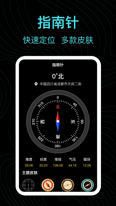 内置的电子指南针经过专业校准,指向精准可靠。在使用前,系统会提示您进行校准操作,确保方向指示的准确性。指南针界面设计简洁明了,即使在强光环境下也能清晰读数。此外,还提供了磁偏角校正功能,进一步提高导航精度。