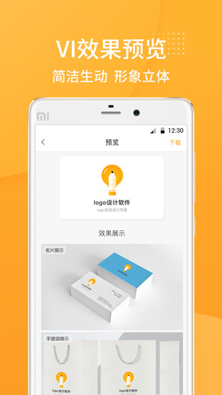 各场景预览效果,包括名片手提袋门牌背景墙以及其它场景展示,帮助用户直观了解logo在不同媒介上的呈现效果。新增的3D立体预览功能,让您全方位评估设计作品的视觉效果。