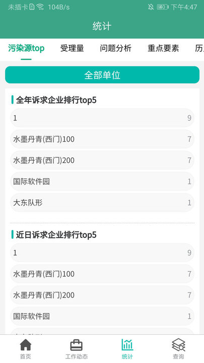 数据统计模块提供多角度分析工具,可按行政区划、污染类型、处理时效等20余个维度生成动态报表,直观展示各承办单位的案件受理量、办结率和群众满意度等核心指标。