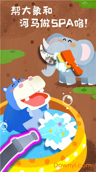 伤口医治完成,做清洁和spa!大象想给象牙做美容,宝宝赶快用刷子刷洗,点一点象鼻,喷出水柱,冲走泡泡,真有趣!这个环节锻炼孩子的手眼协调能力,同时培养爱护动物的意识。