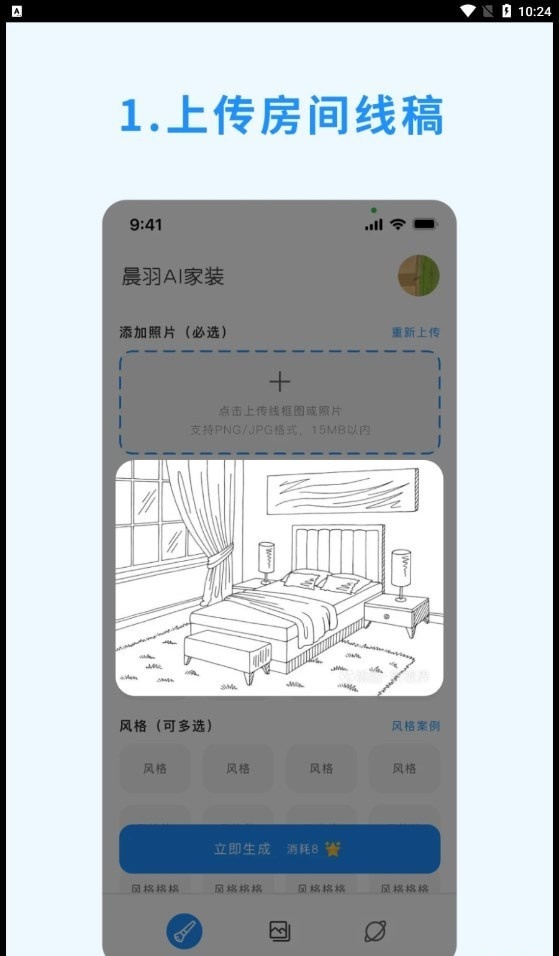 在线上传:支持多种格式的线稿上传,包括手绘草图、CAD图纸等。上传后系统会自动进行三维建模,生成逼真的空间效果,让您直观地看到每个角落的装修效果。