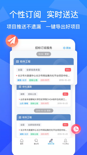 招标推送:根据用户需求定制个性化推送方案,确保第一时间获取相关招标信息。推送范围覆盖全国各地区各行业,支持多终端同步接收。