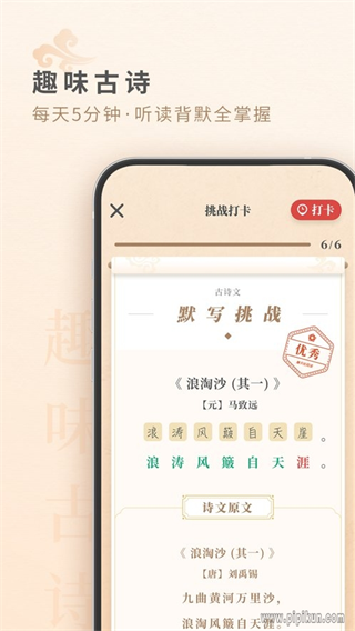 收录了统编语文教材1-9年级古诗,通过每日5分钟的朗读、背诵、默写趣味挑战,帮助学生在日积月累中熟记古诗文,默写不失分! 挑战系统采用智能记忆曲线算法,根据学生掌握程度自动调整复习频率,确保古诗文学习事半功倍。同时设有"诗词大会"在线对战功能,让学生在与同龄人的比拼中检验学习成果,激发学习动力。